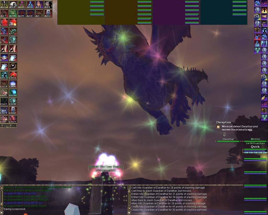 エバークエストの最大の魅力は、「ドラゴンレイド」という、大規模戦闘です。 なが〜いENMクエストをした後に、一匹のドラゴンと最大72人のグループで対決します。 (あれ?どこかで聞いた略語?w ちなみに、EQはEpic Named Mob Questです)