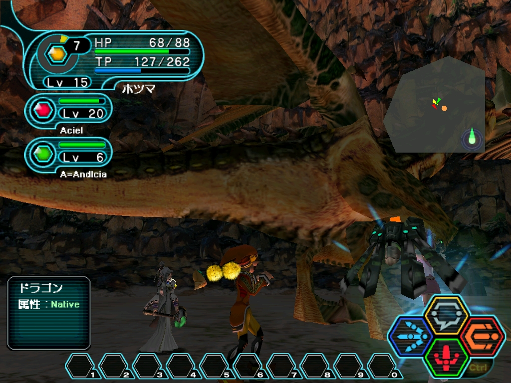 写真1:ドラゴン戦。アンさん、アシエルさんと一緒です。 写真2:ちくわ部の方々と一緒に洞窟へ潜りました。 写真3:同じく、洞窟。僕が、蹴りをしています。 写真4:デ・ロル・レ戦。ちくわ部のハーツさん、攻撃されてひっくり返ってますw 写真5:デ・ロル・レ戦。アンさん、攻撃されてますw