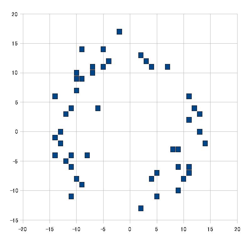 ところで画像は、チョコボの宝探しの実績です。 X方向の正は東、Y方向の正は北です。 原点は???の位置、単位は歩数ですね。 原点から大体13歩のところで宝箱が出ていますが、 ときどき遠い位置や近い位置でも出ていますね。 最近は???の位置から13歩の位置を中心に調べますが、 少ない掘り回数で、この近い/遠いケースを見破れるかが、 連続掘り成功のカギになっている気がします。 |