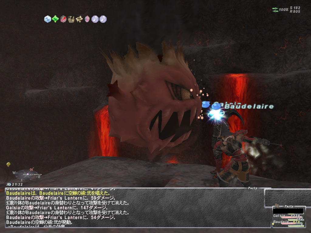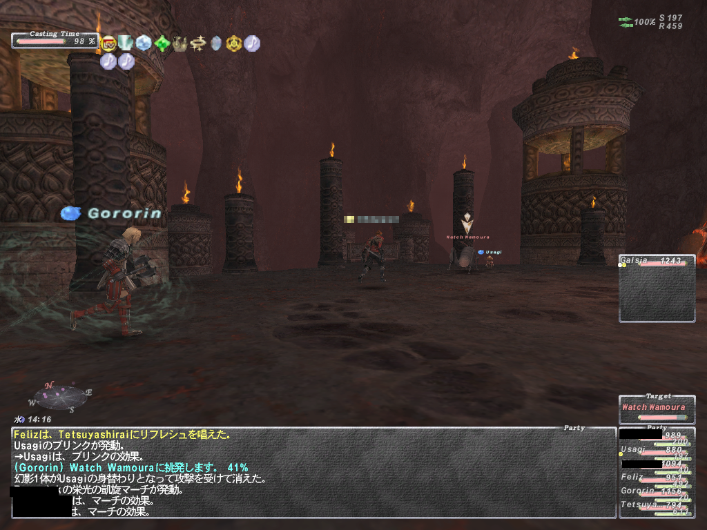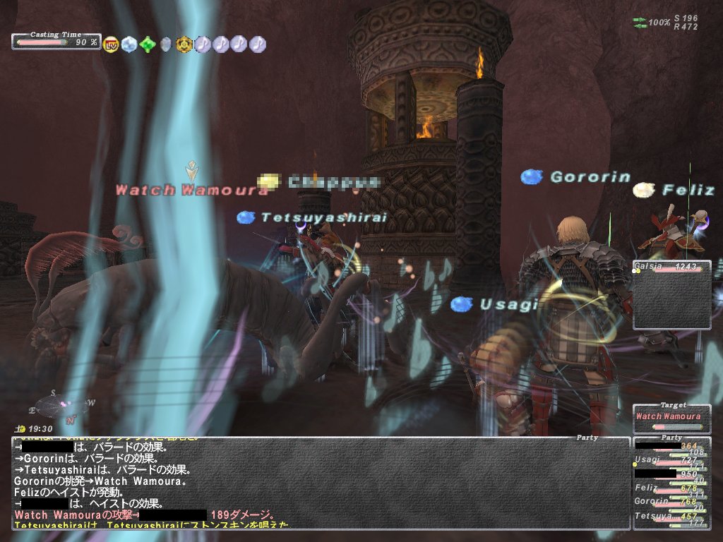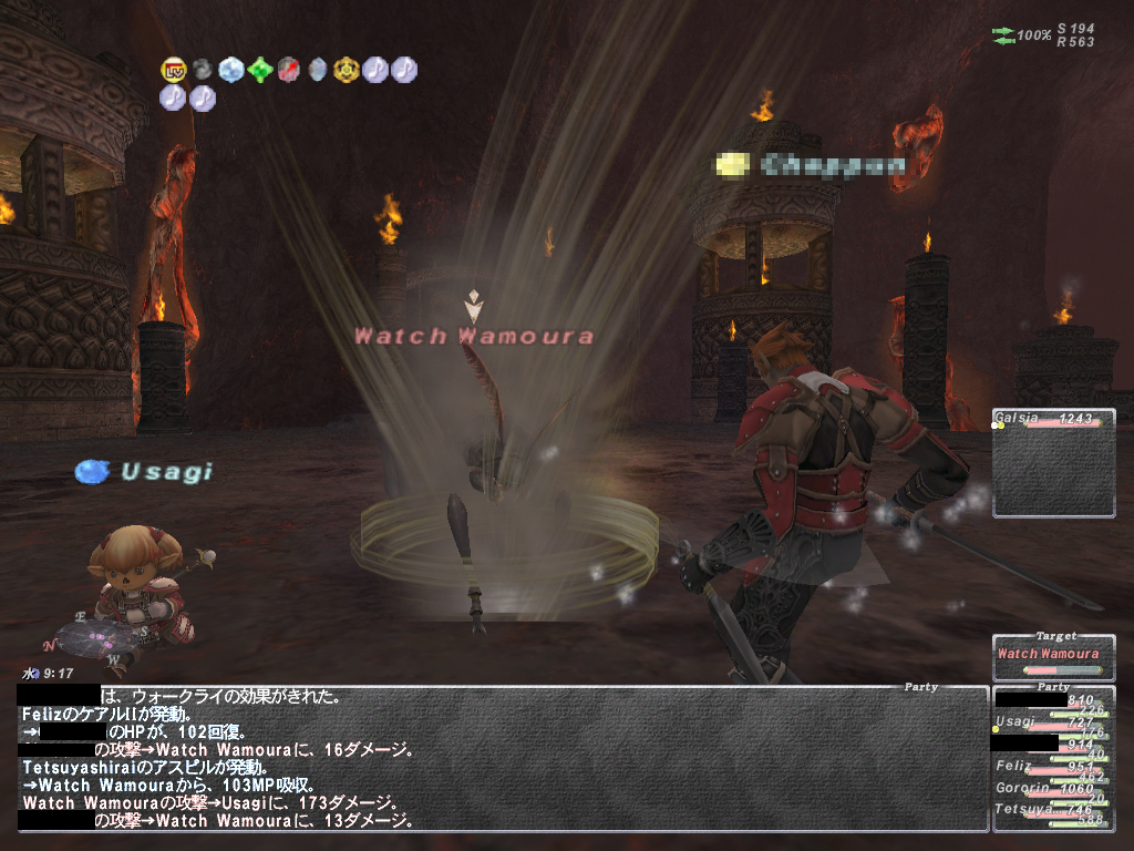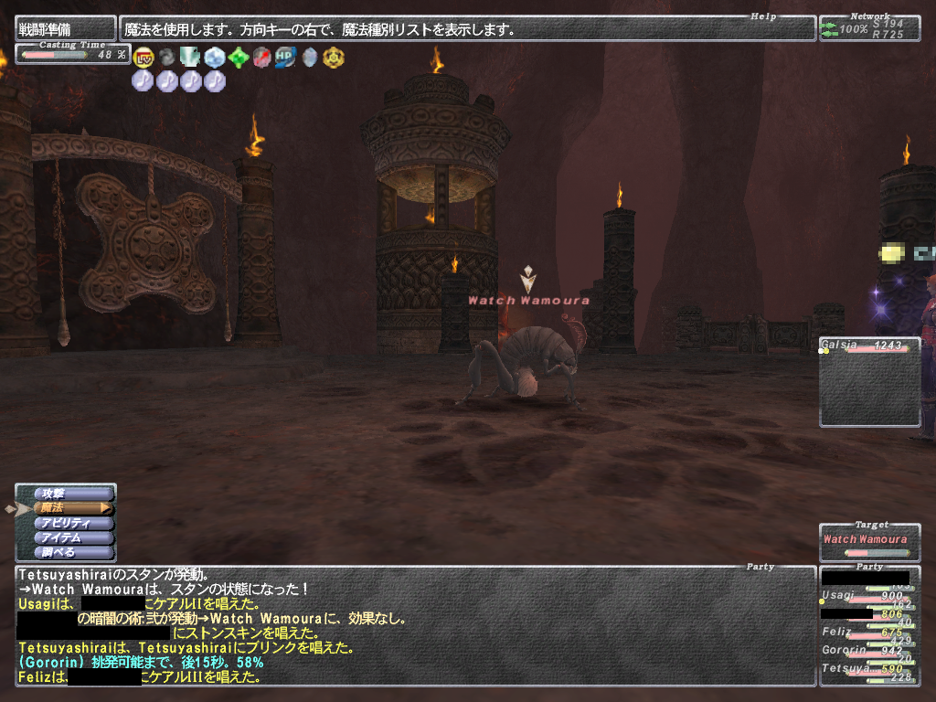 あと範囲静寂+麻痺+悪疫とかヘイスト上書きのスロウとか蝉全禿げのWSなど等 いやらしいWS満載であります。 WS以外はスリ以外は一通り弱体入りますので、やばくなったらグラ、バインドで 建て直しできます。あと範囲攻撃で強烈なのがあるので前衛は蝉持ち推奨 後衛は入り口方面の段の上から魔法当すると範囲食らいません。