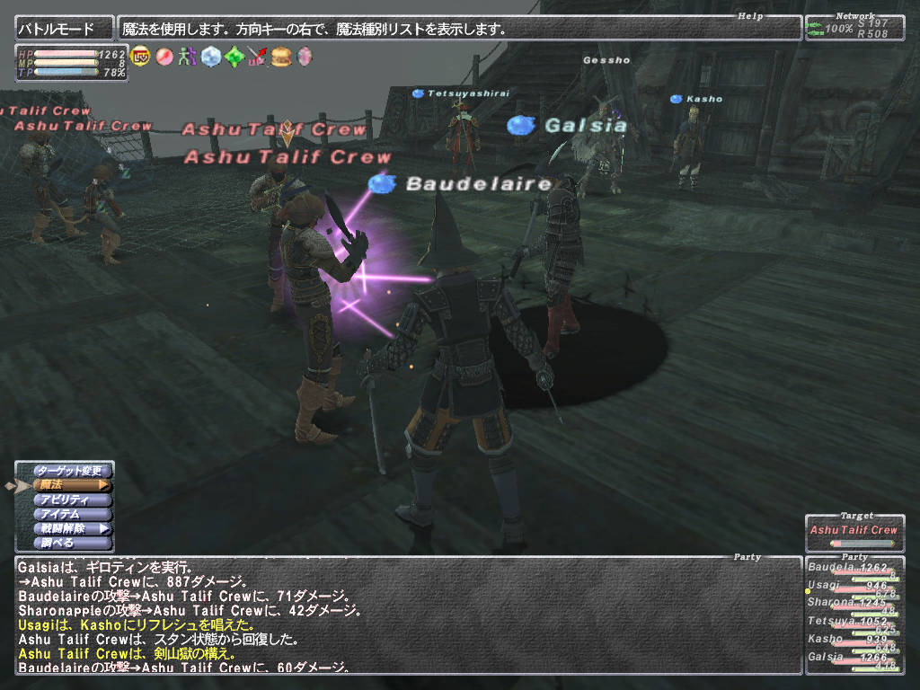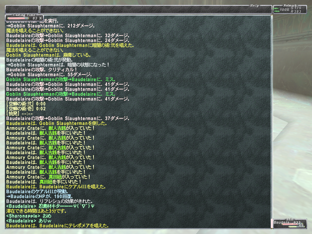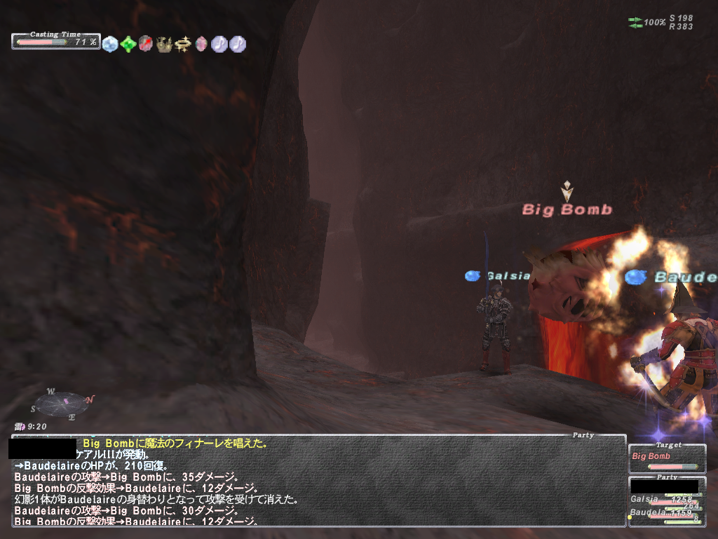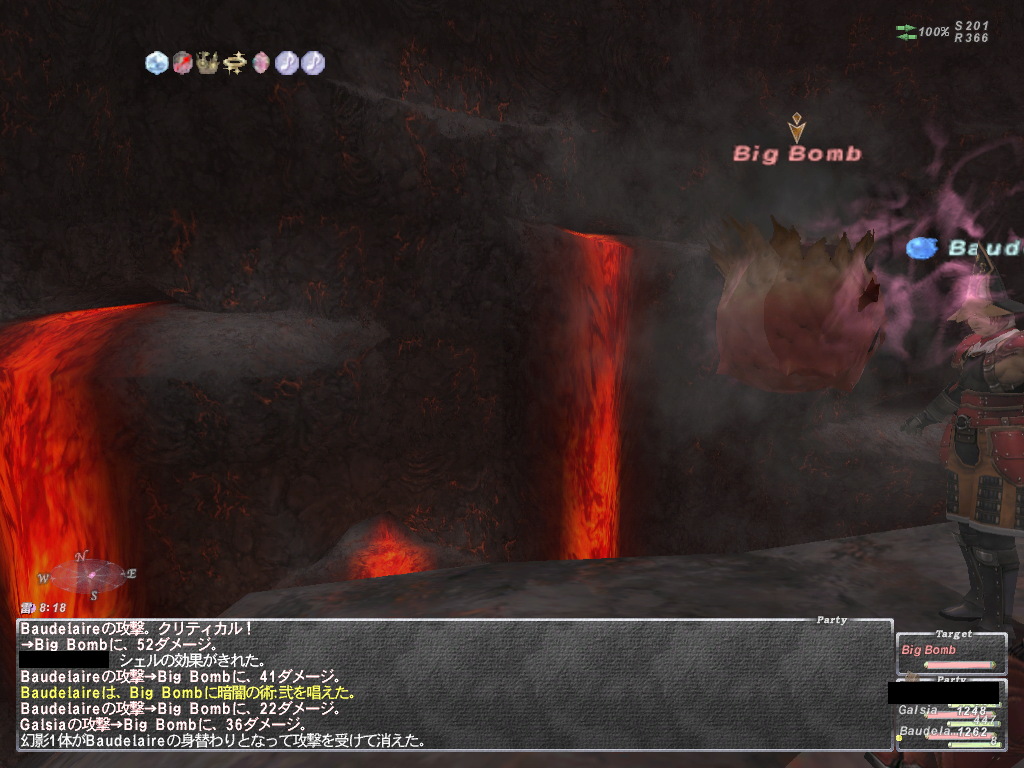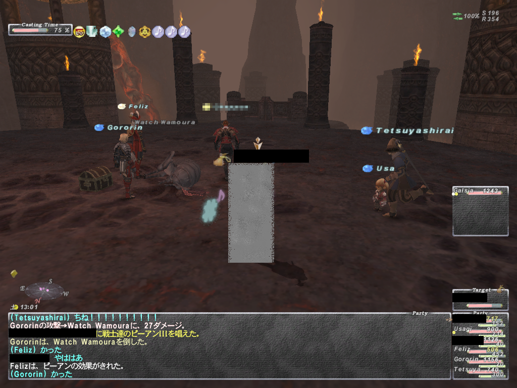 あと範囲静寂+麻痺+悪疫とかヘイスト上書きのスロウとか蝉全禿げのWSなど等 いやらしいWS満載であります。 WS以外はスリ以外は一通り弱体入りますので、やばくなったらグラ、バインドで 建て直しできます。あと範囲攻撃で強烈なのがあるので前衛は蝉持ち推奨 後衛は入り口方面の段の上から魔法当すると範囲食らいません。