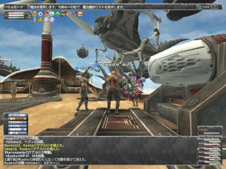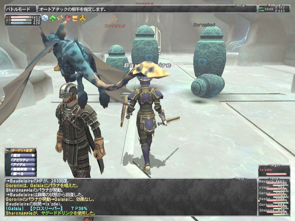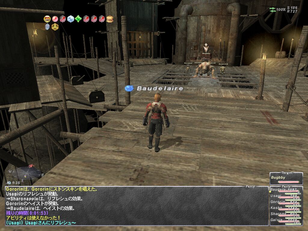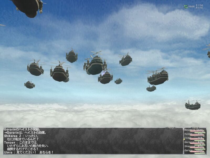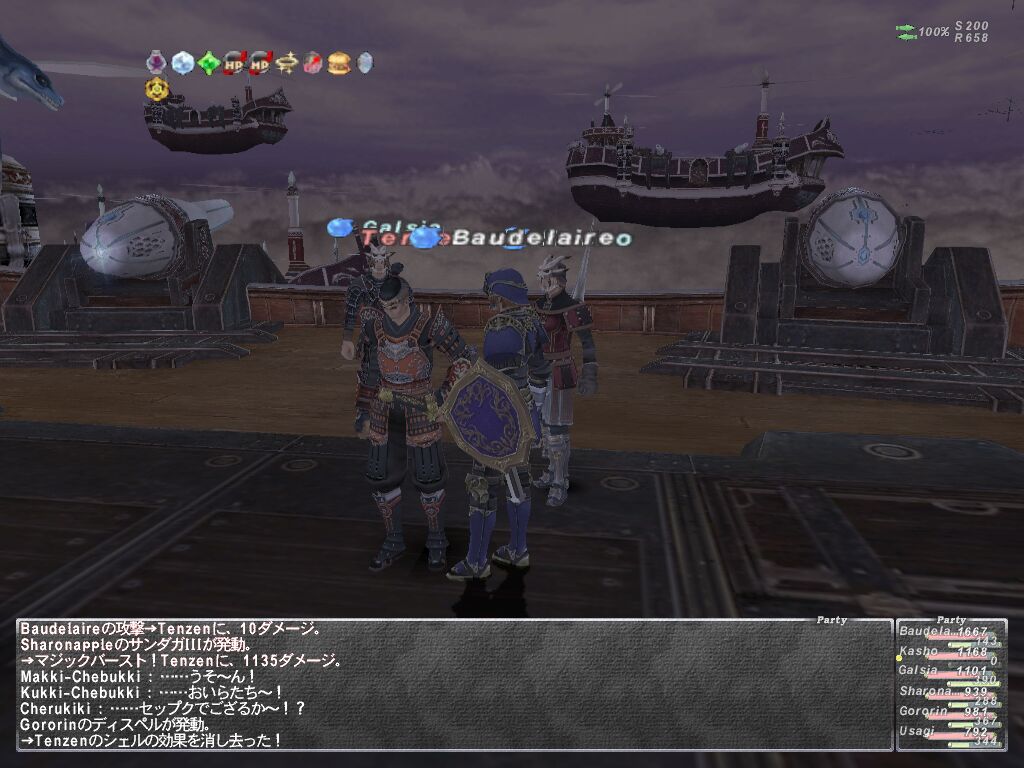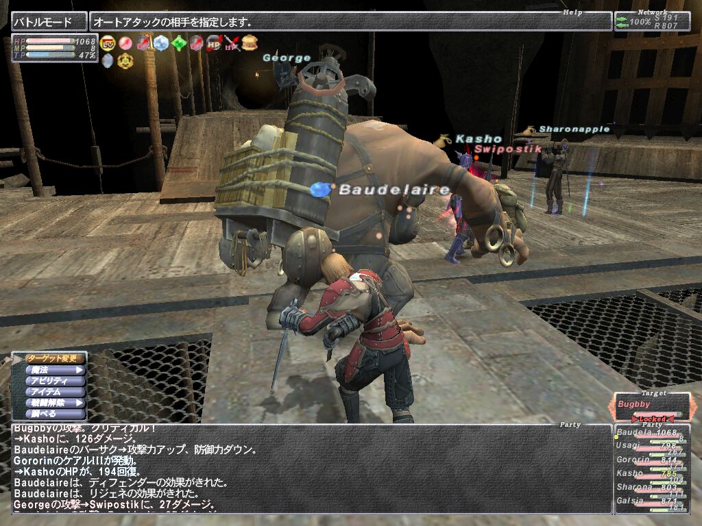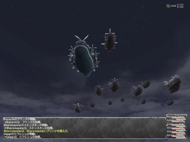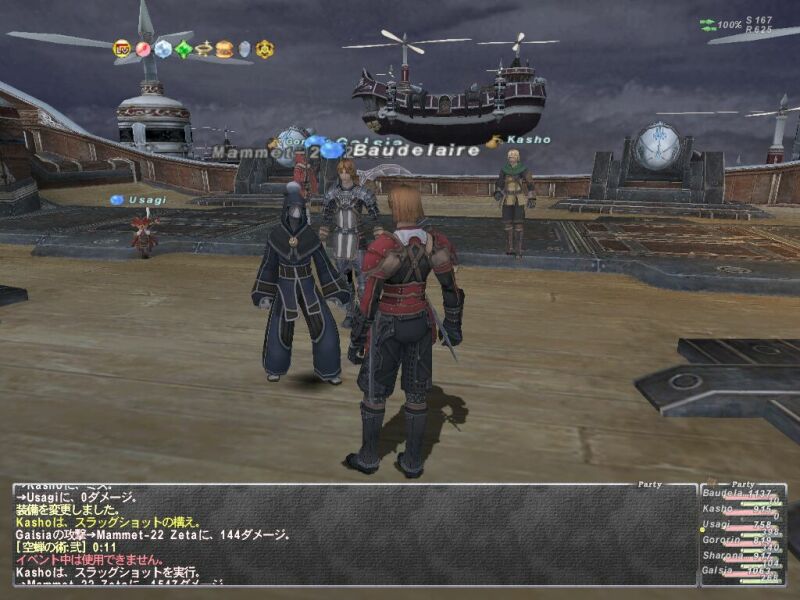 まずマメット5匹は忍者の私が突っ込んで絡まれて、5匹をつれまわし 残りの5人が1匹ずつ倒していくやり方です。 このBCは飛空挺の甲板で戦うのですが、狭いのでマラソンはしにくいです マンボもらって開始するんですが、走ってる途中でバラかかったりしてました。 戦闘の方は私は逃げ回ってるだけなので、状況はイマイチわかりにくいですが 特に問題もなく1匹ずつ処理していって、12,3分で終わってました。