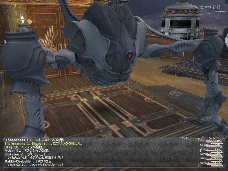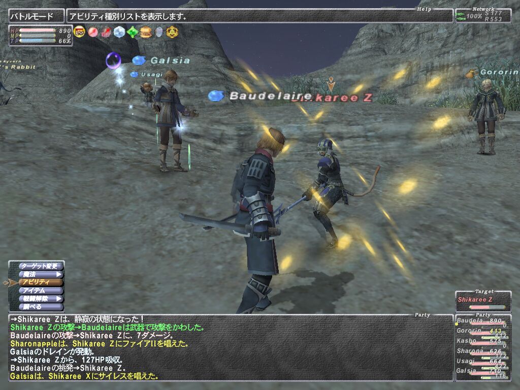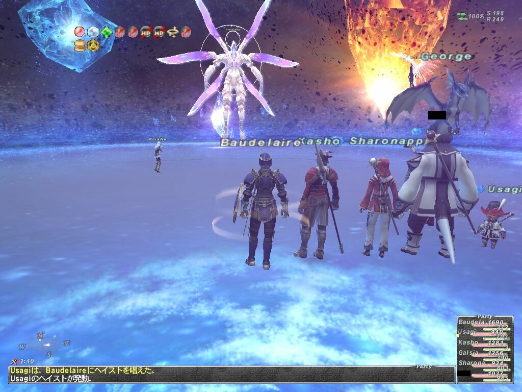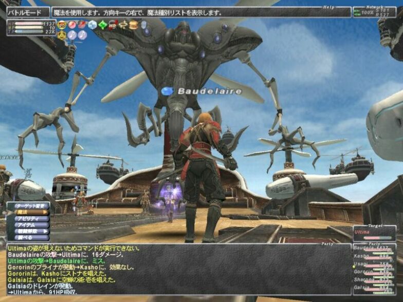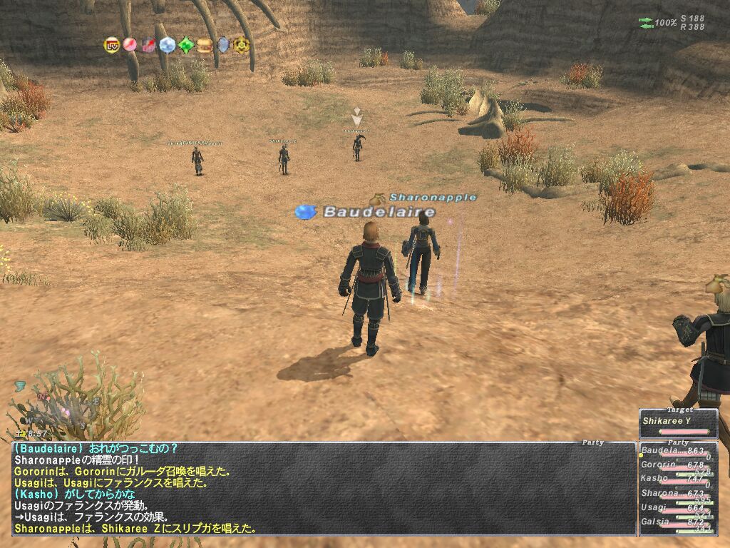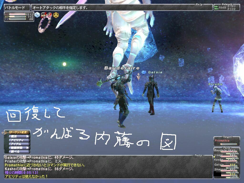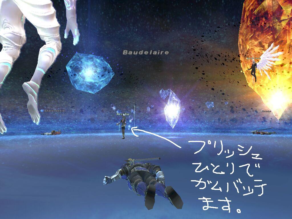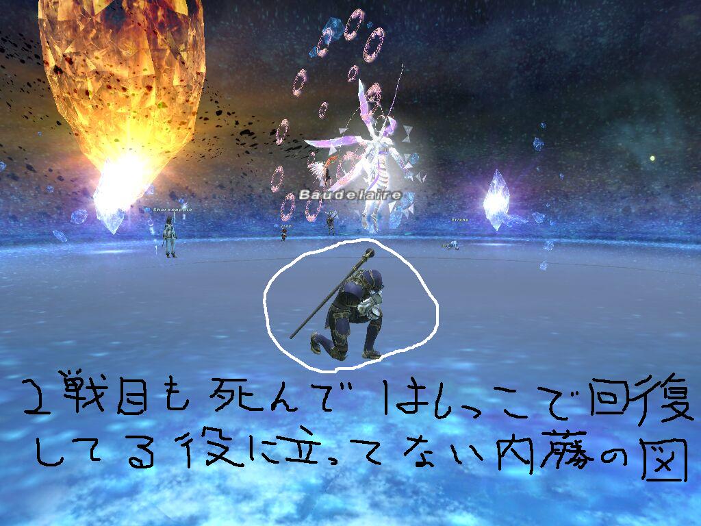 まずマメット5匹は忍者の私が突っ込んで絡まれて、5匹をつれまわし 残りの5人が1匹ずつ倒していくやり方です。 このBCは飛空挺の甲板で戦うのですが、狭いのでマラソンはしにくいです マンボもらって開始するんですが、走ってる途中でバラかかったりしてました。 戦闘の方は私は逃げ回ってるだけなので、状況はイマイチわかりにくいですが 特に問題もなく1匹ずつ処理していって、12,3分で終わってました。