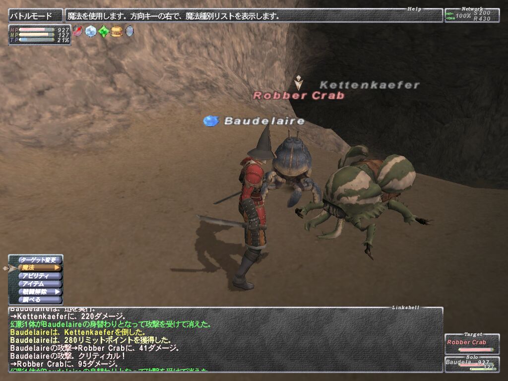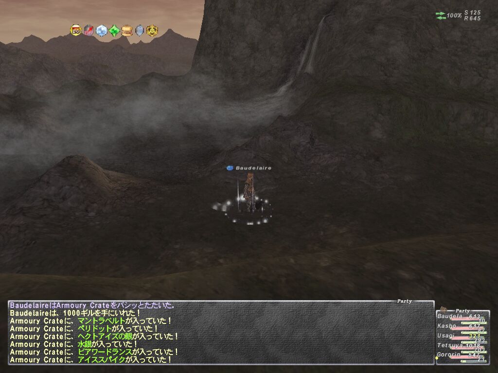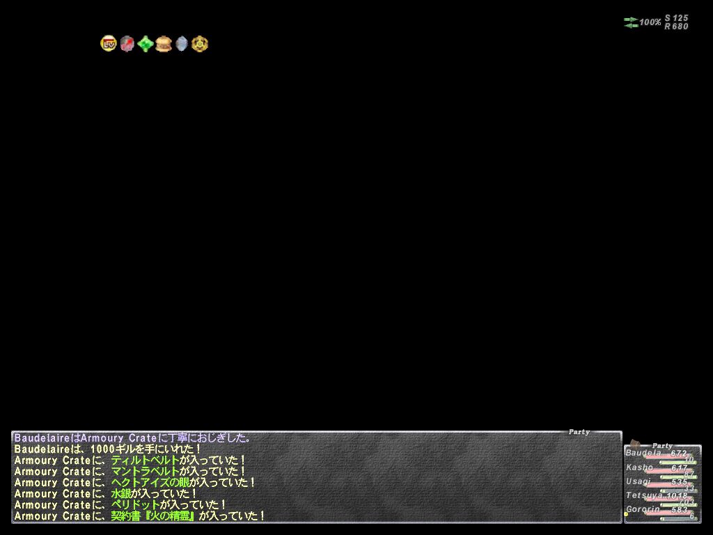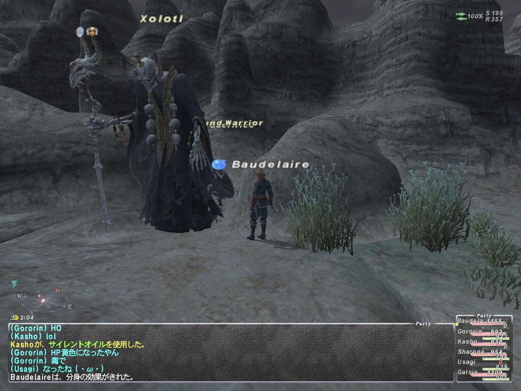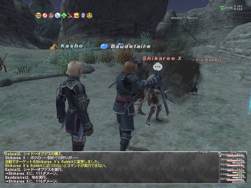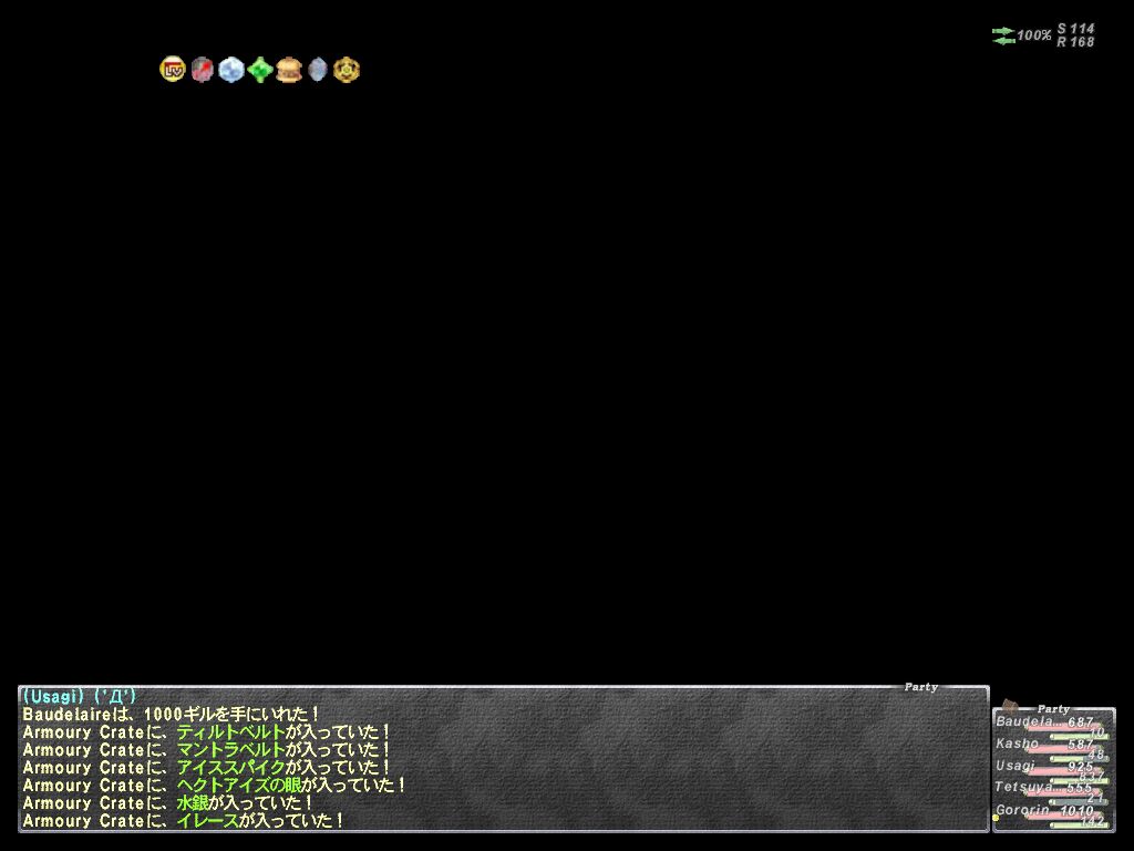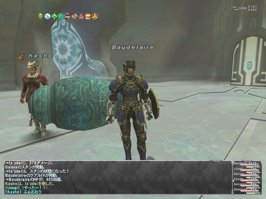まずマメット5匹は忍者の私が突っ込んで絡まれて、5匹をつれまわし 残りの5人が1匹ずつ倒していくやり方です。 このBCは飛空挺の甲板で戦うのですが、狭いのでマラソンはしにくいです マンボもらって開始するんですが、走ってる途中でバラかかったりしてました。 戦闘の方は私は逃げ回ってるだけなので、状況はイマイチわかりにくいですが 特に問題もなく1匹ずつ処理していって、12,3分で終わってました。